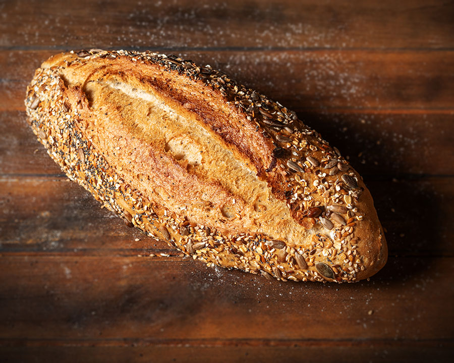 Elaborado con harina de trigo. Fermentado muy lentamente. De corteza fina y crujiente. Es nuestro pan emblemático.